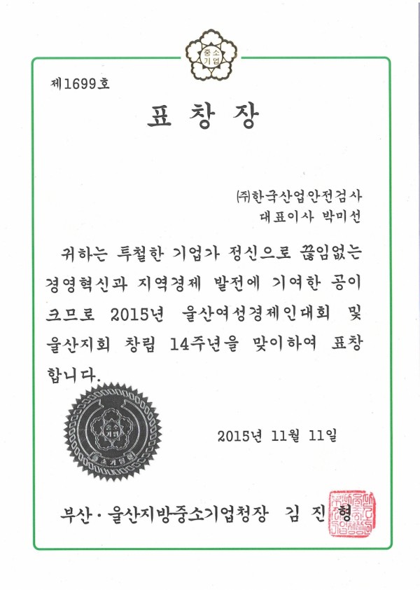 우리회사 대표이사님께서 부산 ,울산 중기업청장 표창장을 수상 하였습니다.